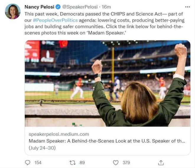 此前,在亚洲行路上的美国国会众议院议长佩洛西在推特上发文,提到所谓民主党人通过“芯片和科学法案”,但没有提及台湾。