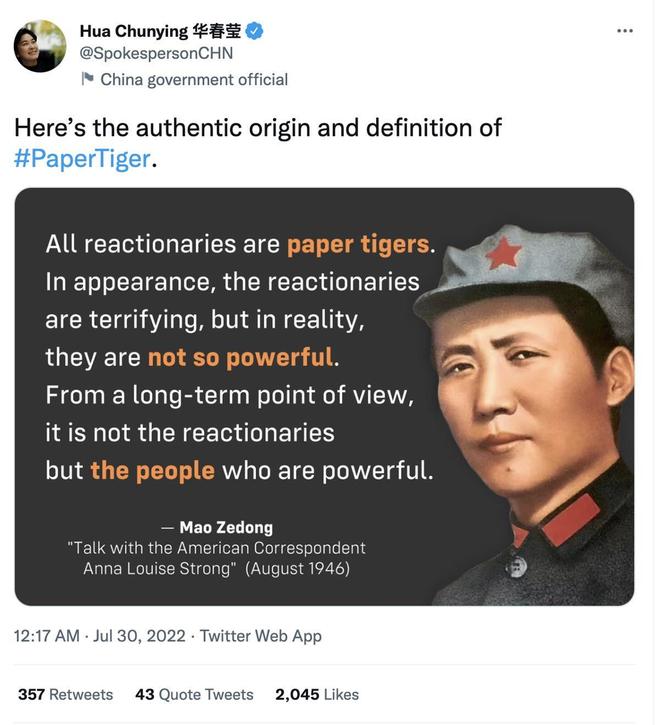 美国众议院议长佩洛西盛传窜访台湾之际,7月30日,中国外交部发言人华春莹在推特上发文,为外国网友科普“纸老虎”的涵义。