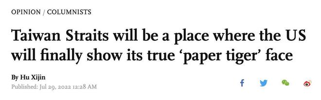 此外,今年7月29日,胡锡进在海外版《环球时报》上也发表评论《台海将是美国最终露出“纸老虎”真面目的地方》。