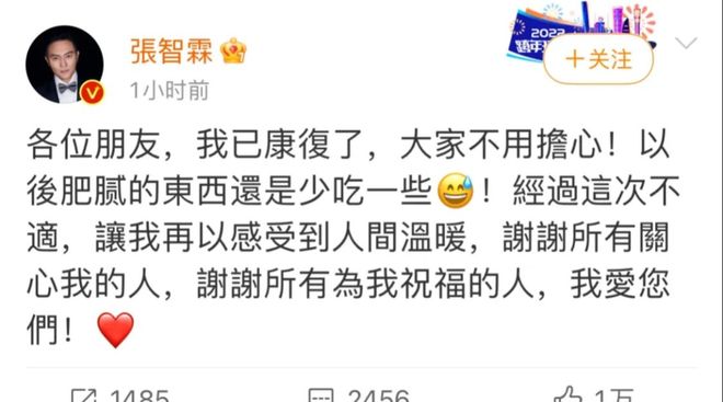 好在有惊无险,张智霖的病已经好了。好多喜欢他的网友纷纷在评论区发言,提醒张智霖注意身体健康呢!