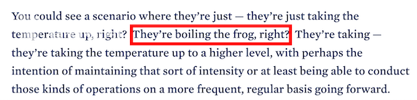 “你可以看到这样的一个场景:他们在,他们在提高温度,对吧?他们在煮青蛙,对吧?他们提高,他们在提高温度到一个新的高度,这可能是他们想要维持这种强度,或者至少以后更频繁的、更常规地去进行这样的操作。”