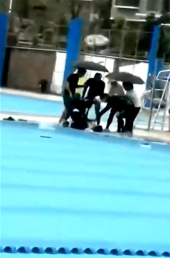 现场监控视频显示,一名男孩在游泳池角落戏水,在身体全部沉下水面后,突然挥舞起较大的水花,附近游泳的儿童上前帮忙,但一直无法将水下的孩子拉起。有人立即招呼安全员赶到现场,随后数名安全员和教练跳入水中救人,并疏散了其他游泳的孩子,最终男孩被成功救起放到岸边,并有人开始为其做心肺复苏。