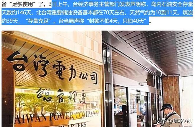 正如岛内媒体所说,封锁不怕4天,就怕40天。因为岛内的能源储备是很脆弱的,天然气能撑11天、石油能撑146天、煤炭79天。