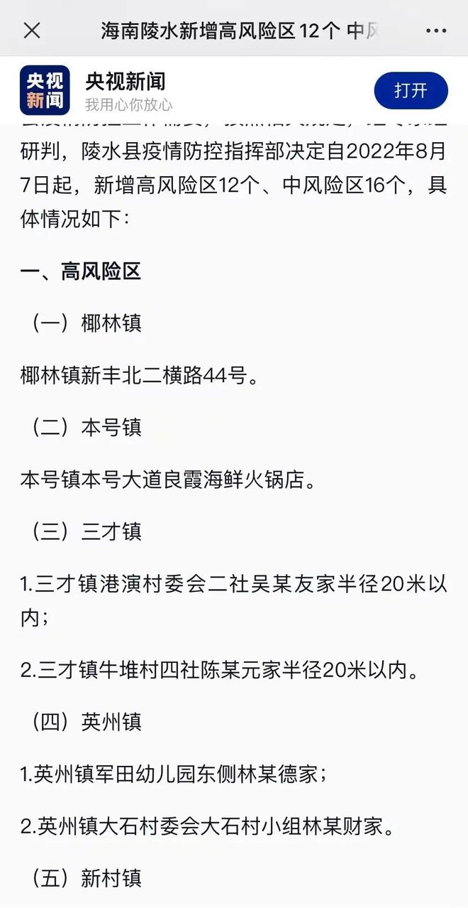 根据陵水黎族自治县疫情防控工作需要,按照相关规定,经专家组研判,陵水县疫情防控指挥部决定自2022年8月7日起,新增高风险区12个、中风险区16个。