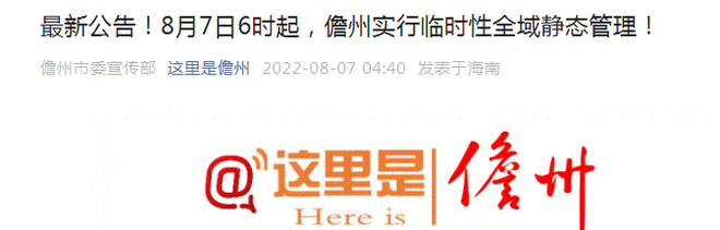 7日凌晨,海南儋州市疫情防控指挥部研究决定,自2022年8月7日6时起,全市实行临时性全域静态管理。