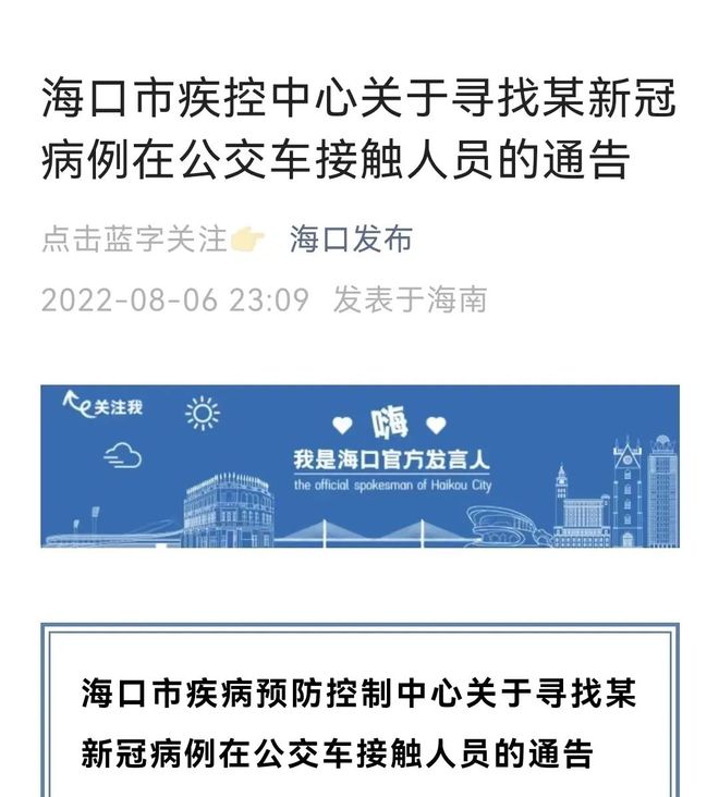 据海口发布微信号消息,8月6日晚,海南省海口市疾病预防控制中心发布寻找某新冠病例在公交车接触人员的通告,经流行病学调查,某新冠病例在海口市有多次乘坐公交车史。