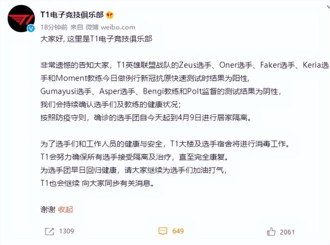 事情是这样的,如下图所示,近日T1战队突然晋级官宣了一条消息。大概内容就是在新冠检测测试中,队内四位首发选手呈阳性。这四位选手分别是上单Zeus、打野Oner、中单Faker以及辅助Keria。另外,教练Moment也呈阳性。