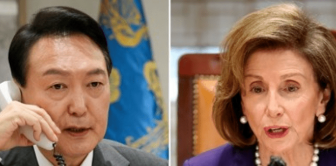 佩洛西访问亚洲期间,尹锡悦未见佩洛西,仅与其通话。图源:韩联社