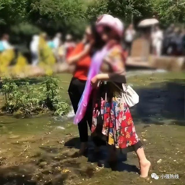 “九寨沟景区内几名大妈脱鞋下水打卡拍照”