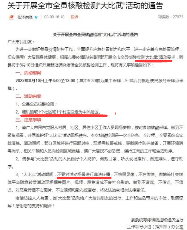 最近,山东省临沂市临沭县发布了一份活动通知,要开展全市全员核酸检测“大比武”。