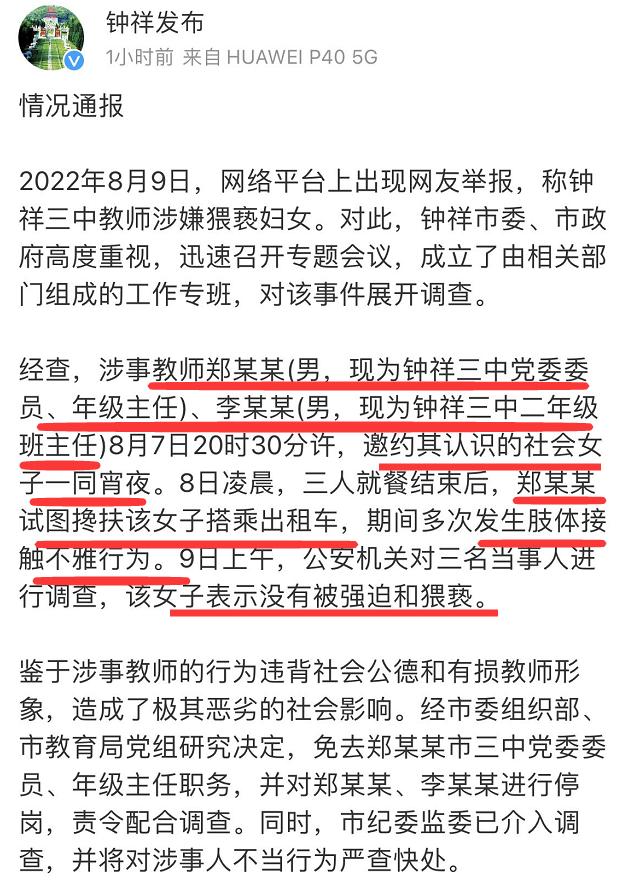 8月7日,有人拍到两名男子对一位醉酒女士有亲搂抱以及其他侵犯性动作,事情曝光后,两人被认出是钟祥三中的老师。