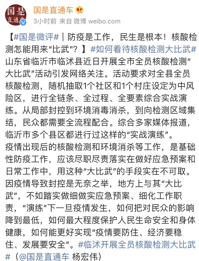 《防疫是工作,民生是根本!核酸检测怎能用来“比武”?》中新社“国是直通车”