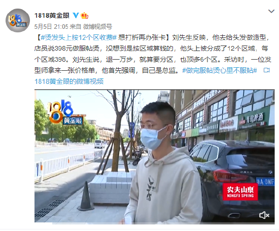 【#烫发头上按12个区收费# 想打折再办张卡】刘先生反映,他去给头发做造型,店员说398元做服帖烫,没想到是按区域算钱的,他头上被分成了12个区域,每个区域398。刘先生说,退一万步,就算要分区,也顶多6个区。采访时,一位发型师拿来一张价格单,他首先强调,自己是总监。#做完服帖烫心里不服帖#