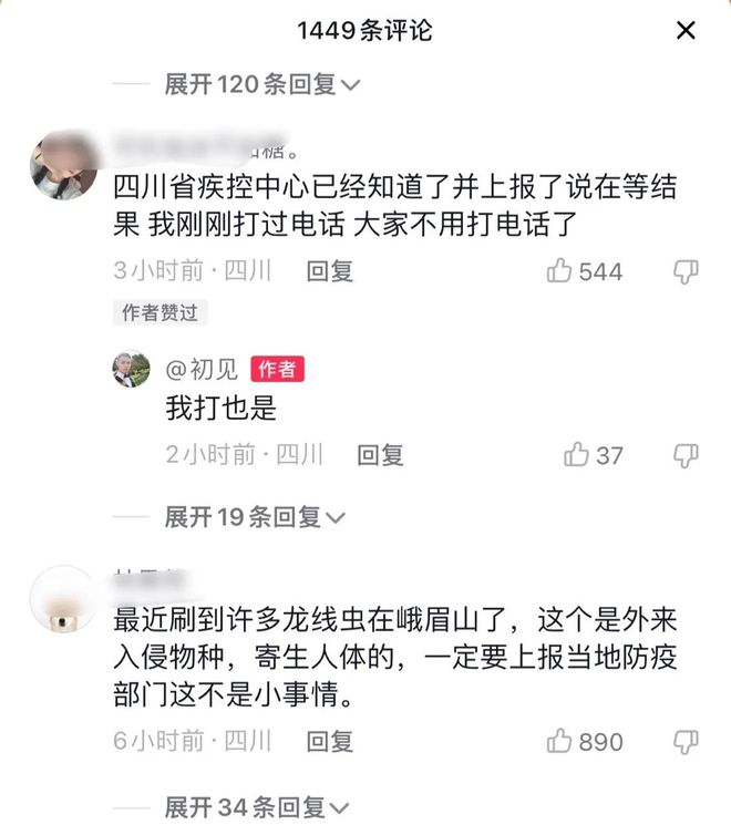 此前,在发现疑似龙线虫的视频下,网友反映:已上报当地疾控部门。