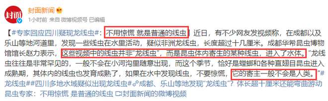 最新消息:专家回应称,视频中的并非龙线虫,就是普通的线虫,它的寄主一般不会是人类,这下大家终于可以放心了。