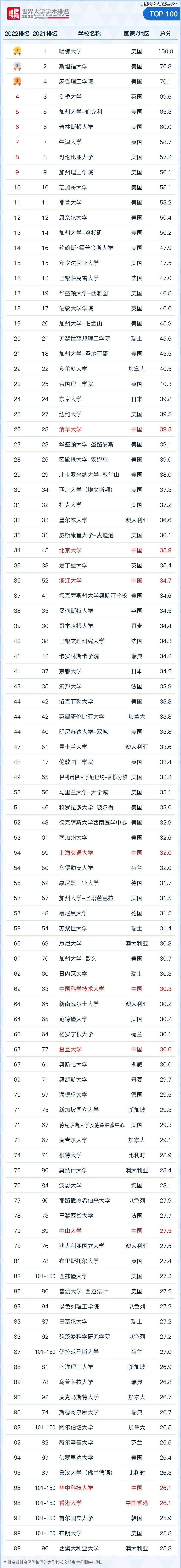 哈佛大学、斯坦福大学和加州大学伯克利分校分别位居世界前三。中国大陆排名前三的是清华大学,世界第101,北京大学,世界第193,浙江大学,世界第201。清华大学离世界前100强只有一步之遥。