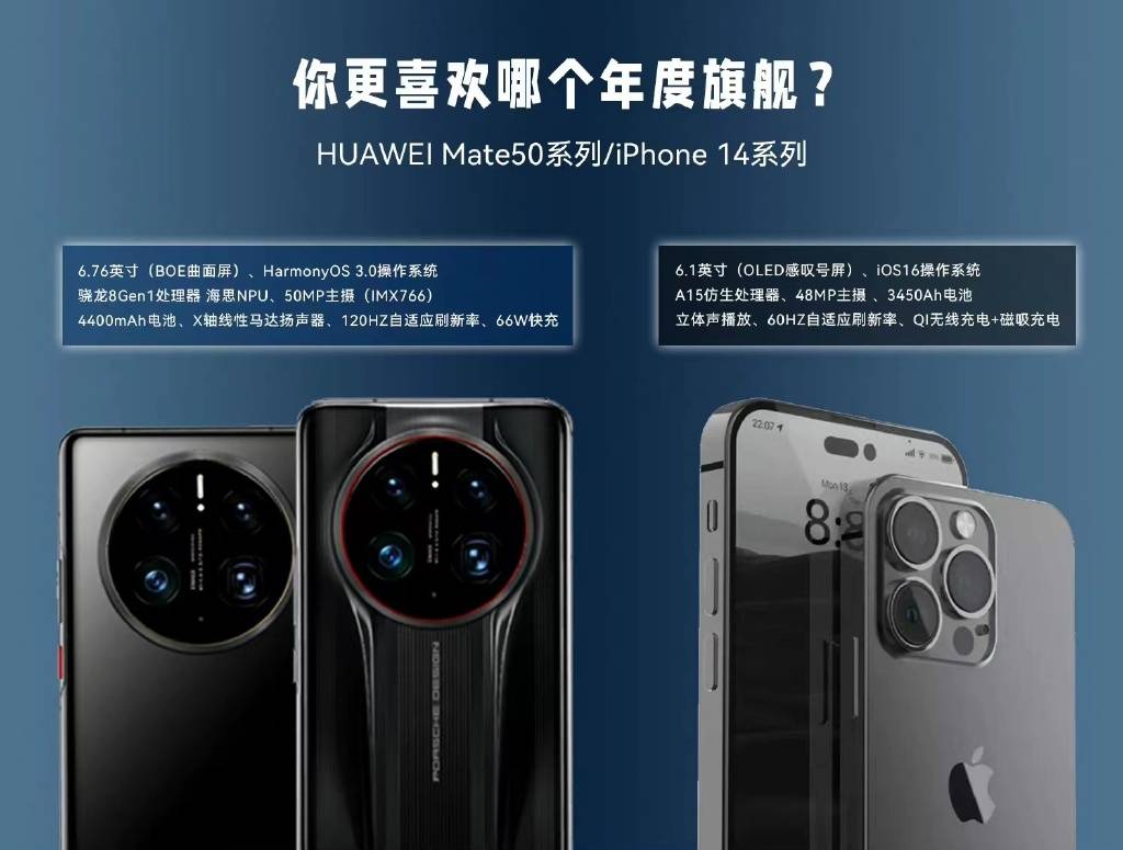 最近网传比较火的几张iPhone14系列与华为Mate50系列对比图。当iPhone14遇上Mate50,你会选择谁?