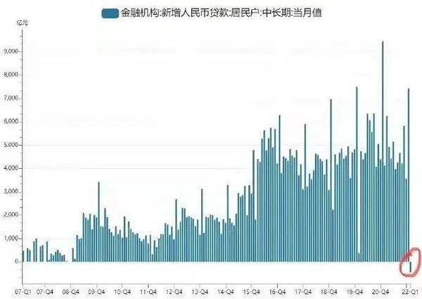 统计自2007年1月开始,此后的“人民币中长期住户贷款”持续增加,但到了2022年2月,这个数据突然变成了负数。