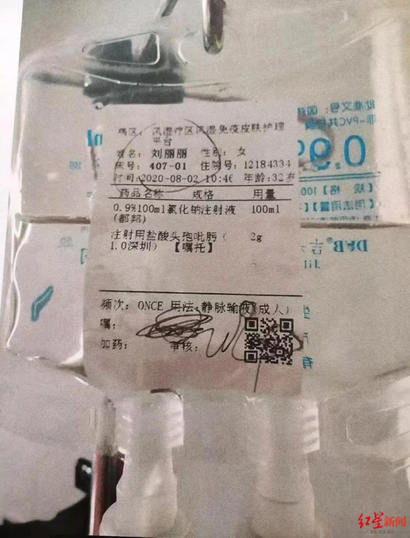 张女士告诉红星新闻记者,8月2日,她看到医生使用头孢吡肟,便向医生提出质疑,说女儿对头孢过敏,但医生表示可以使用。她便拍下了输液袋的照片,输液袋上的时间为10点46分。