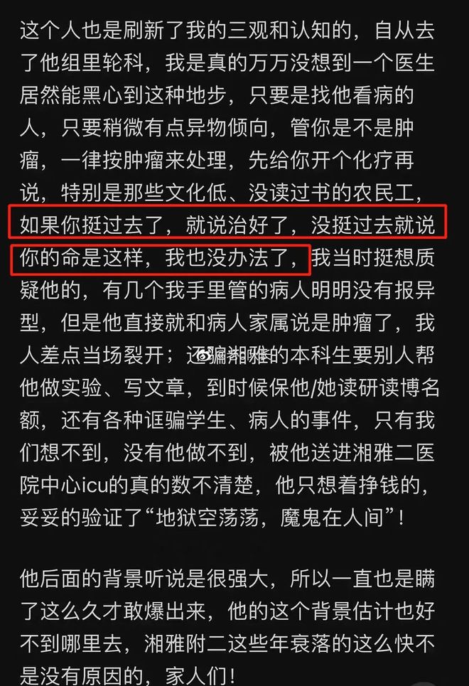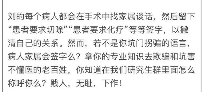 还有几位自称患者家属的爆料称,这名医生洗脑和唆使患者,肆意修改已经制定好的手术方案,最后导致手术失败,引发医疗事故。