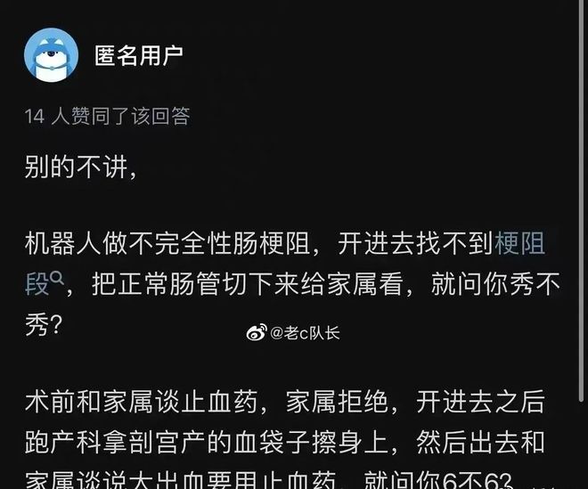 爆料中说,有位小女孩因为肠梗阻去该院检查,这名医生直接让动手术,手术过程中,因为机器人做不完全性肠梗阻,没有找到梗阻段。