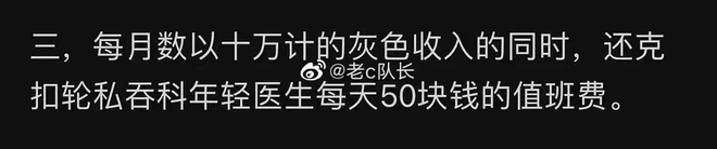 这名医生不仅医德败坏,还十分贪婪,唯利是图,为了谋取金钱,经常以各种理由克扣下属医生的工资,私吞医院里药品和器材的费用,甚至连实习医生每天50块钱的值班费也不放过。