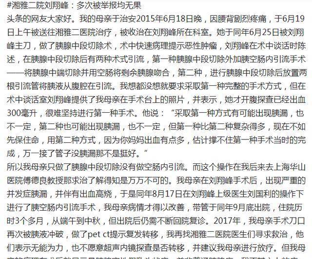 网名叫“小白木头”的网友继续称,按照刘某峰的建议,他母亲的胰腺中段被切除,但术后的效果并不好。无奈之下,他只好带着母亲前往上海华山医院傅德良教授那里进行求治,当傅德良教授了解过情况后认为:刘某峰采用第二种方案给其母亲做手术是一种极端的错误,并建议他带着母亲重回湘雅二医院按照第一种方案做手术,于是,他便带着母亲重新找到了刘某峰。8月17日,在刘某峰的上级医生刘某利的亲自操作下,他的母亲才按照第一种方案做了手术。在按照第一种方案做完手术后,他母亲的病情才得以改善。