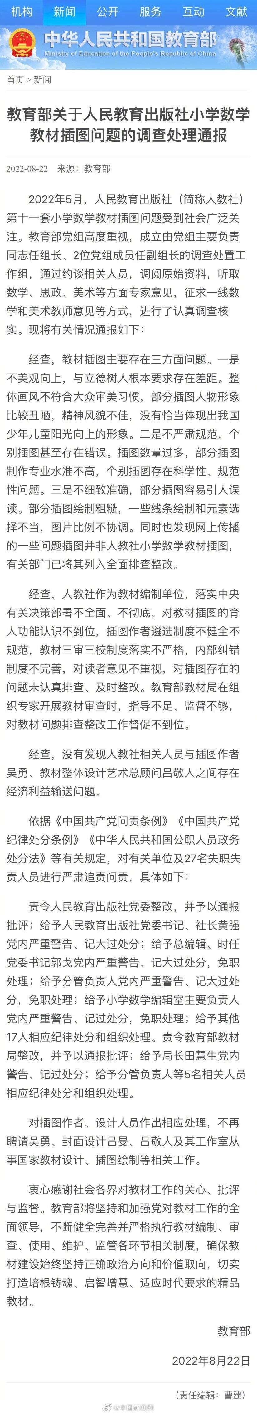 责令人民教育出版社党委整改,并予以通报批评;给予人民教育出版社党委书记、社长黄强党内严重警告、记大过处分;给予总编辑、时任党委书记郭戈党内严重警告、记大过处分,免职处理;给予分管负责人党内严重警告、记大过处分,免职处理;给予小学数学编辑室主要负责人党内严重警告、记过处分,免职处理;给予其他17人相应纪律处分和组织处理。责令教育部教材局整改,并予以通报批评;给予局长田慧生党内警告、记过处分;给予分管负责人等5名相关人员相应纪律处分和组织处理。