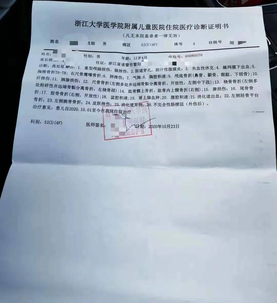 潇湘晨报记者在浙江大学医学院附属儿童医院的一份诊断书上看到,小军一共有23处诊断记录,包括重型颅脑损伤,失血性休克,消化道出血,全身多处骨头骨折等等。