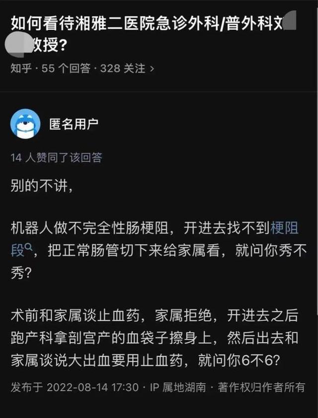1.湘雅二院 刘翔峰这种黑医生,像黄鼠狼一样,喜欢吸血,吃内脏。遇到这种野兽,保护内脏。