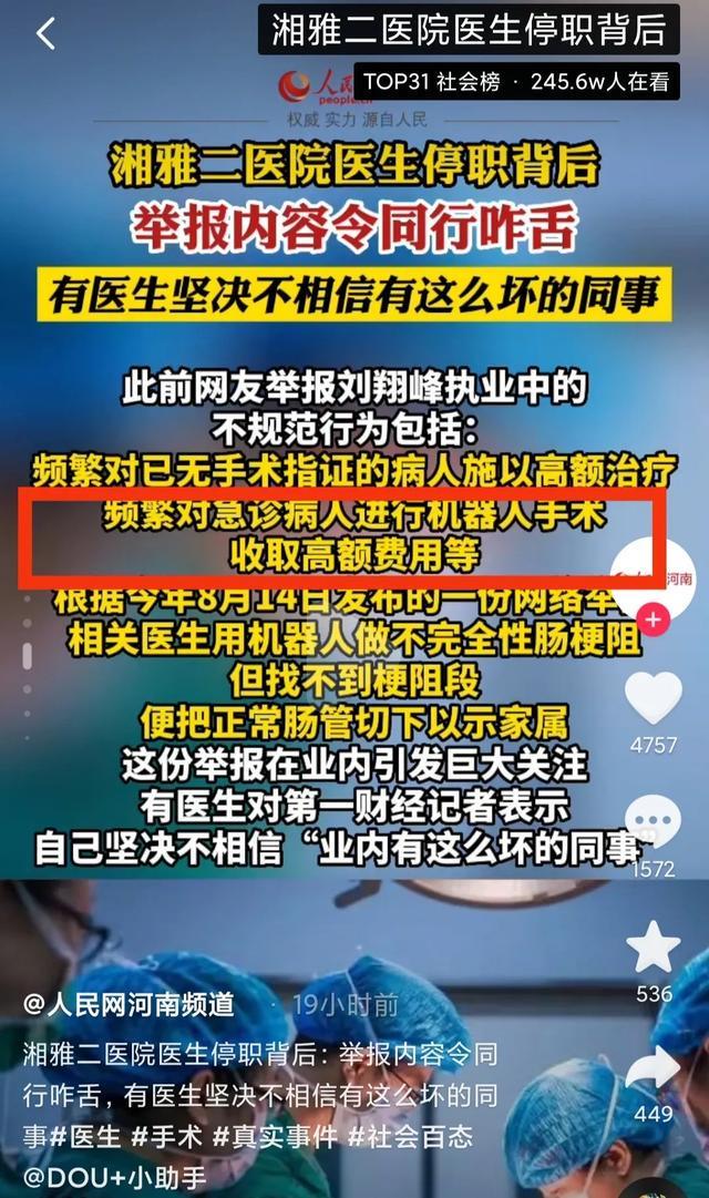 前几天被多次举报的刘某峰,已经有了初步结果。他被停职,并暂停其操作权限以接受进一步调查。刘某峰虽然失去了当医生的底线,但每个人心里都明镜似的。他不可能独自取得如此巨大的成就,“频繁给急诊病人做机器人手术”。#机器人手术#“机器人手术”一个人就能做?