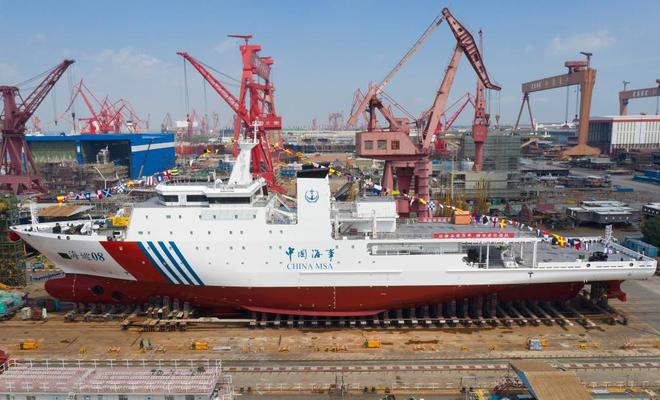 7月8日拍摄的“海巡08”轮(无人机照片)。当日,我国具备深远海测量能力的专业海道测量船“海巡08”轮在中国船舶集团有限公司下水。新华社记者 丁汀 摄