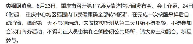 重庆:8月24日0时起中心城区市民健康码全部转“橙码”,完成一次核酸采样后自动消窗。其实也没啥,就是让你按时做核算。这样就不会有误差。