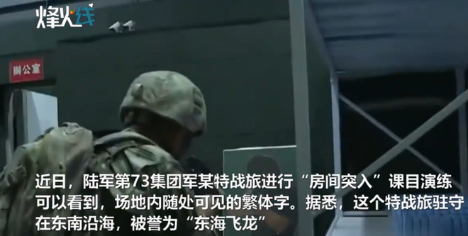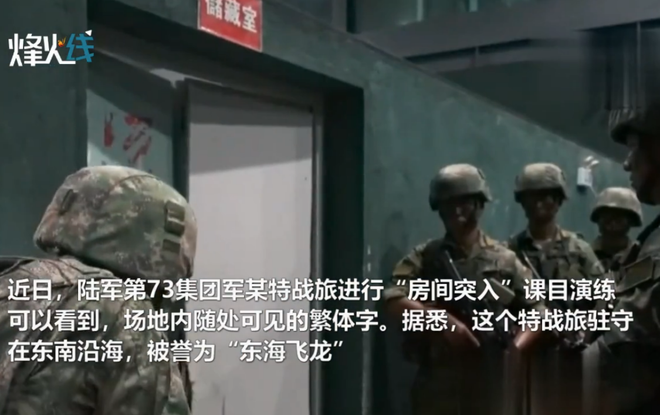 近日,我陆军某特战旅进行“房间突入”课目演练,演练场地内的繁体字随处可见。据悉,该特战旅驻守在东南沿海,被誉为“东海飞龙”。
