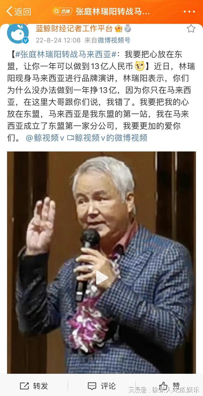 近日,林瑞阳现身马来西亚,参加公司举办的活动。张庭夫妇看内地市场做不下去了,于是转战到马来西亚,同样的方法同样的诚恳同样的激情澎湃,“我一毛钱都不想赚”,为了帮助大家创业致富,苦口婆心做宣传,重操旧业卖护肤品,没想到一样受人追捧。