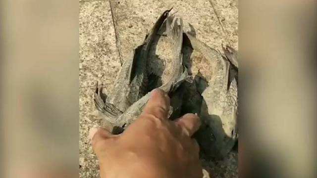 视频中,大半个月没有回家的父亲突然想起楼顶的鱼池,当打开楼顶的门后,眼前的一幕着实让他惊呆了。楼顶鱼池已经只剩下一块块干巴的黑色块状物,小鱼也都被晒成了鱼干。有网友调侃道,“可以想象鱼当时是多么绝望”。