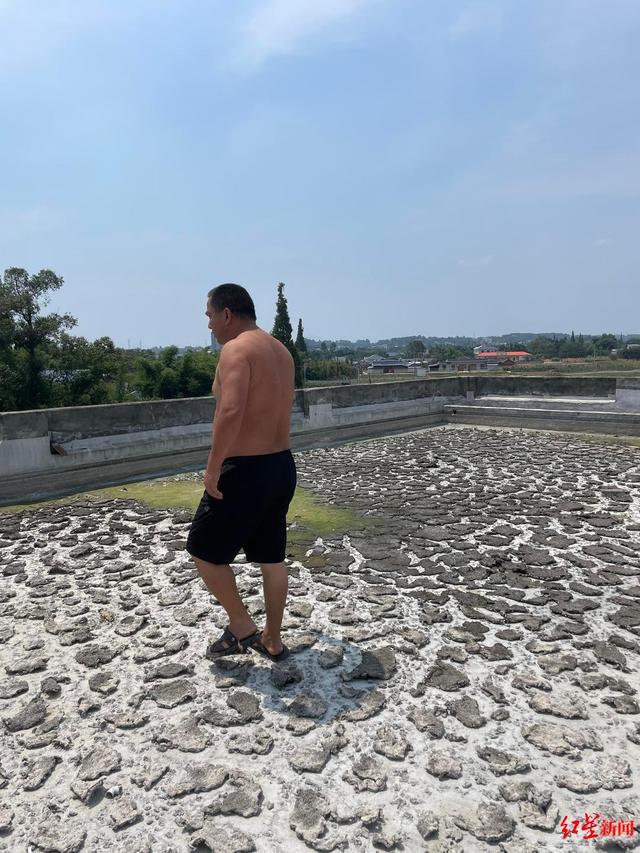 ↑8月23日,徐女士父亲站在晒干了的鱼池里