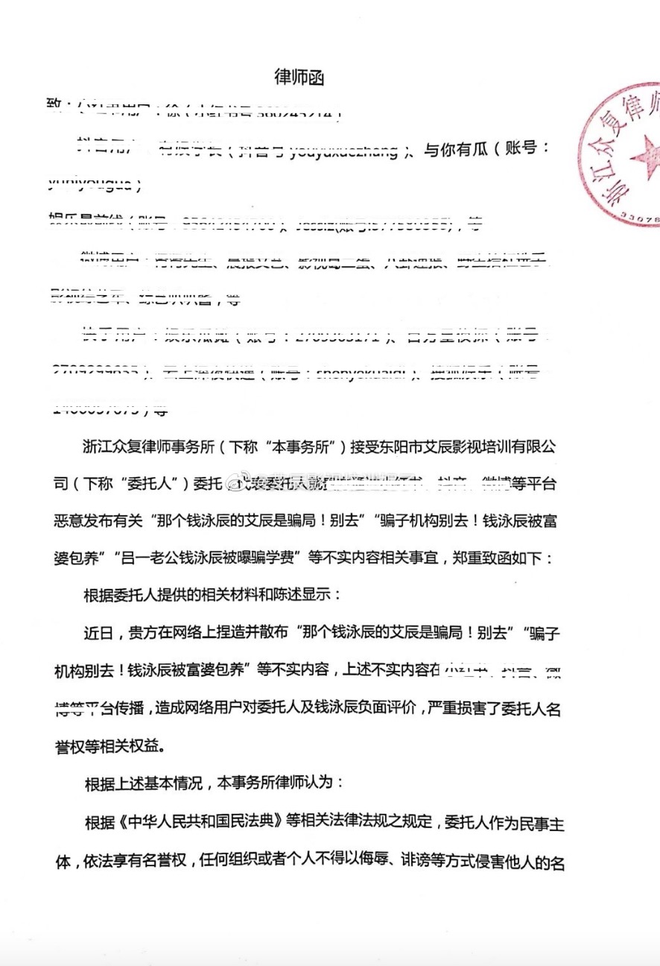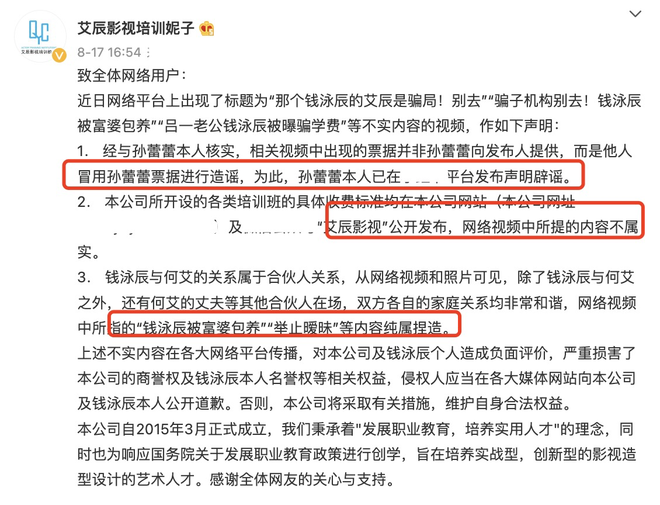 事件爆发次日,艾辰影视迅速响应,发出律师函进行强势辟谣。他们表示关于造谣者曝出的票据,系为冒名顶替;此外学校的收费标准均公开,网传学费相关内容不属实;另外,钱泳辰和何艾属于合伙人关系,双方各自的家庭关系和睦,网传等内容均为捏造。