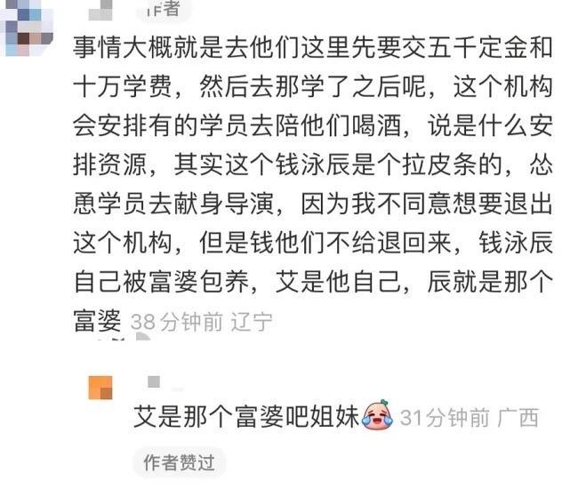 该网友又爆料交钱后就会安排什么资源,教导学员潜规则。而且爆料者还表示钱泳辰与合伙人女老板何艾有暧昧关系,疑似包养。