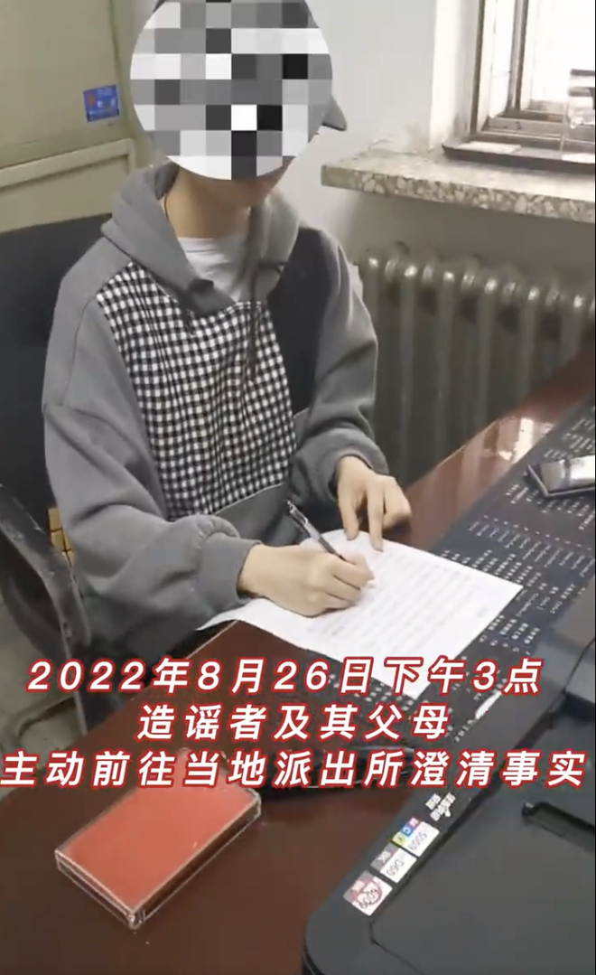根据视频显示,8月26日下午3时,造谣者系始作俑者在家长的陪伴下去当地派出所说明情况,澄清事实,还大众一真相。