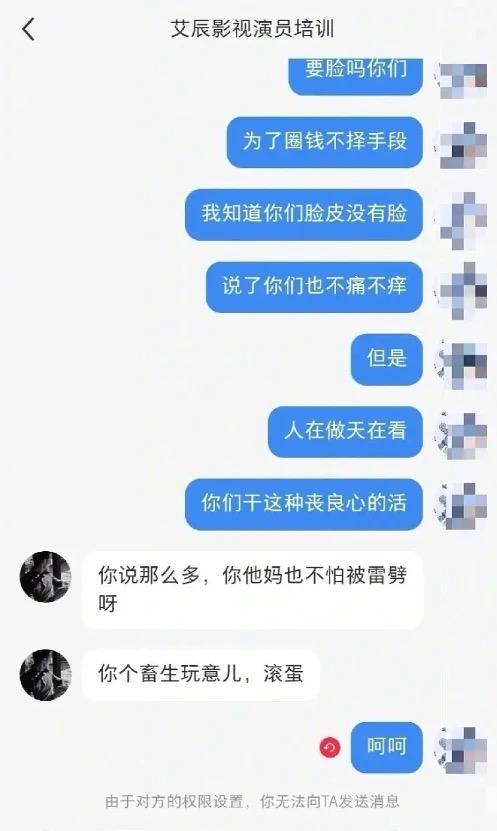 此外该网友还晒出与名称为“艾辰影视演员培训”的社交账号的聊天记录,对方言论粗鄙,令人瞠目结舌。