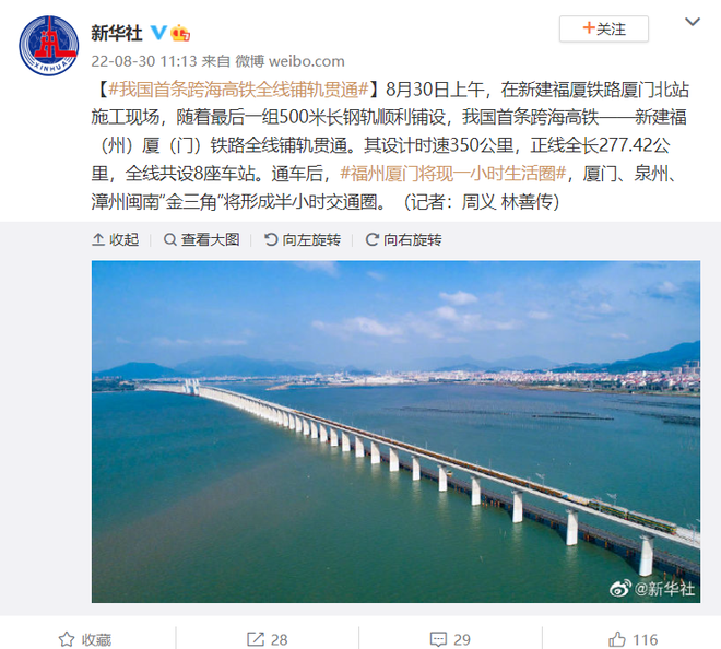 IT之家 8 月 30 日消息,据新华社报道,今日上午,我国首条跨海高铁“福厦高铁”全线铺轨贯通。