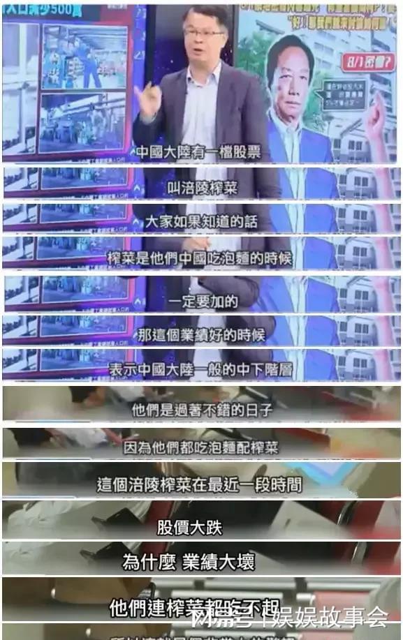 黄世聪在节目中表示,大陆一般的中下阶层是过着不错的日子,因为他(她)们都吃泡面配榨菜,但是,你们知道吗?这个涪陵榨菜在最近一段时间股价大跌,业绩大坏!为什么业绩大坏?因为他们连榨菜都吃不起。