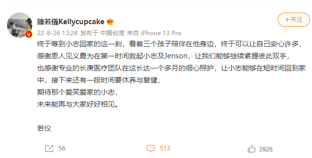 网易娱乐8月26日报道 26日,林志颖车祸后首次上线发文报平安,随后,妻子陈若仪也在社交平台发文称“终于等到小志回家的这一刻,看着三个孩子陪伴在他身边,终于可以让自己安心许多。”她还感谢恩人见义勇为在第一时间救起林志颖及儿子Jenson,让他们能够继续紧握彼此双手,也感谢专业的长庚医疗团队在这长达一个多月的细心照护,让林志颖能够在短时间回到家中。她表示:“接下来还有一段时间要休养与复健,期待那个爱笑爱家的小志,未来能再与大家好好相见。
