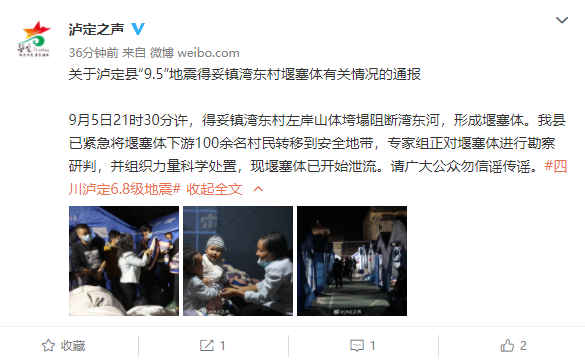 9月6日,@泸定之声 发布关于泸定县“9.5”地震得妥镇湾东村堰塞体有关情况的通报:9月5日21时30分许,得妥镇湾东村左岸山体垮塌阻断湾东河,形成堰塞体。泸定县已紧急将堰塞体下游100余名村民转移到安全地带,专家组正对堰塞体进行勘察研判,并组织力量科学处置,现堰塞体已开始泄流。请广大公众勿信谣传谣。