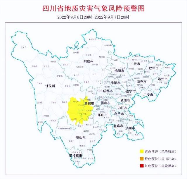 四川省地质灾害指挥部办公室发布9月6日20时至9月7日20时,全省地质灾害气象风险3级黄色预警。此次预警区域为:雅安市天全县、荥经县、汉源县、石棉县,甘孜藏族自治州康定市、泸定县、九龙县、雅江县,凉山彝族自治州冕宁县、甘洛县等3市(州)10个县市。
