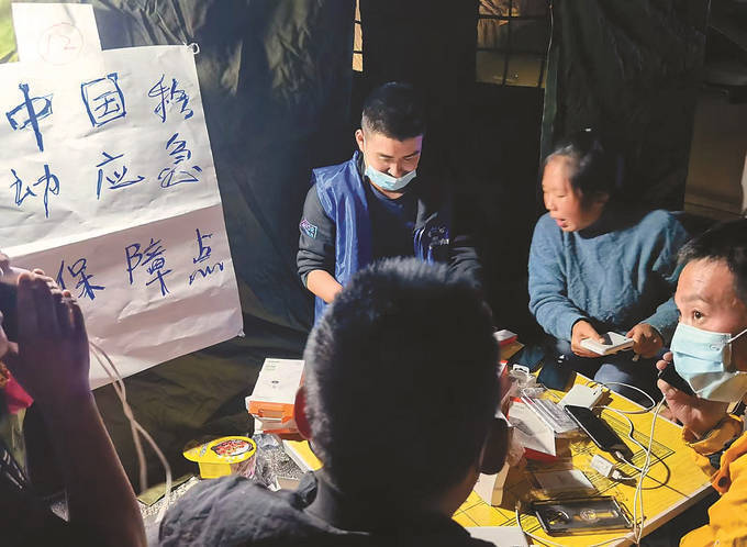 中国移动四川公司应急保障人员在泸定县磨西镇搭建应急保障点,为群众提供便民服务。