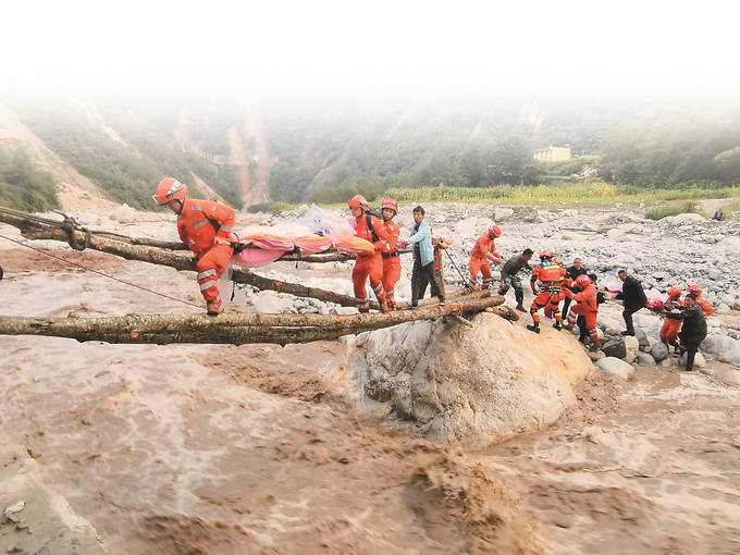 武警四川总队机动第二支队官兵在甘孜州泸定县磨西镇磨子沟村搭建临时木桥转移被困群众。