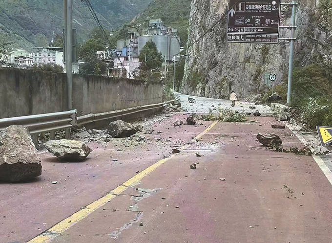 山石掉落在四川省甘孜州泸定县冷碛镇附近的道路上。