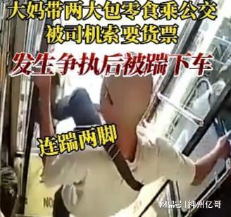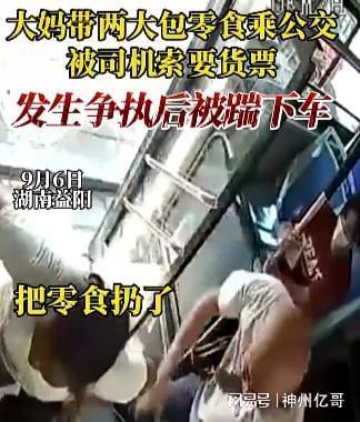 零食也要买货票!湖南,益阳。一位大妈带着两大包零食上了一辆公交车。司机见后,要求大妈为零食买货票。双方因此发生争执,司机一气之下将大妈的零食全部扔下车,并将大妈踹下公交车。